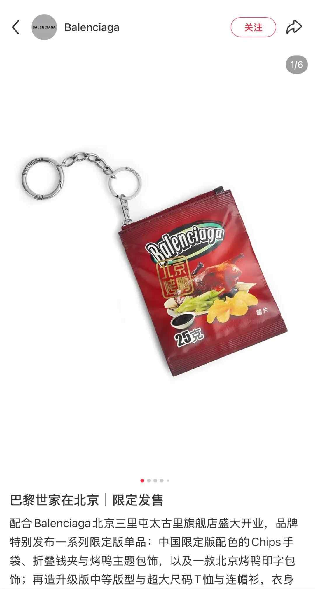 该工作人员表示,这款手拿包专柜售价15500元,只在巴黎世家北京地区门店限量销售,“这款卖得非常不错,5月27日开售以来卖了近20只,现在店内仅剩一只全新的。”目前中国区官网在售的“北京烤鸭”系列仅有钥匙链,售价6500元,且是缺货状态。