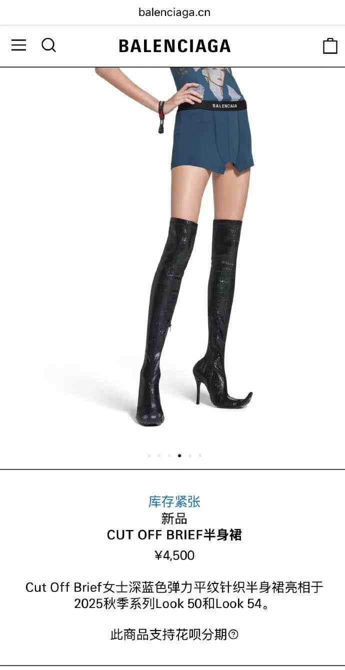 据巴黎世家官网介绍,该女士深蓝色弹力平纹针织半身裙亮相于2025秋季系列Look 50和Look 54,为弹力棉混纺平纹针织面料,平角短裤造型迷你半身裙、剪裁裆部,中腰设计,弹性腰头饰以Balenciaga标识,售价为4500元。