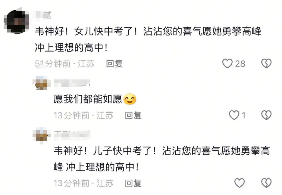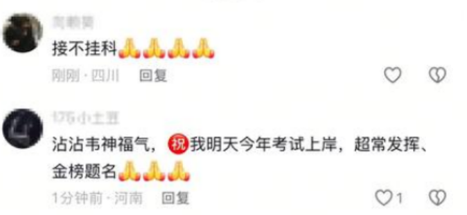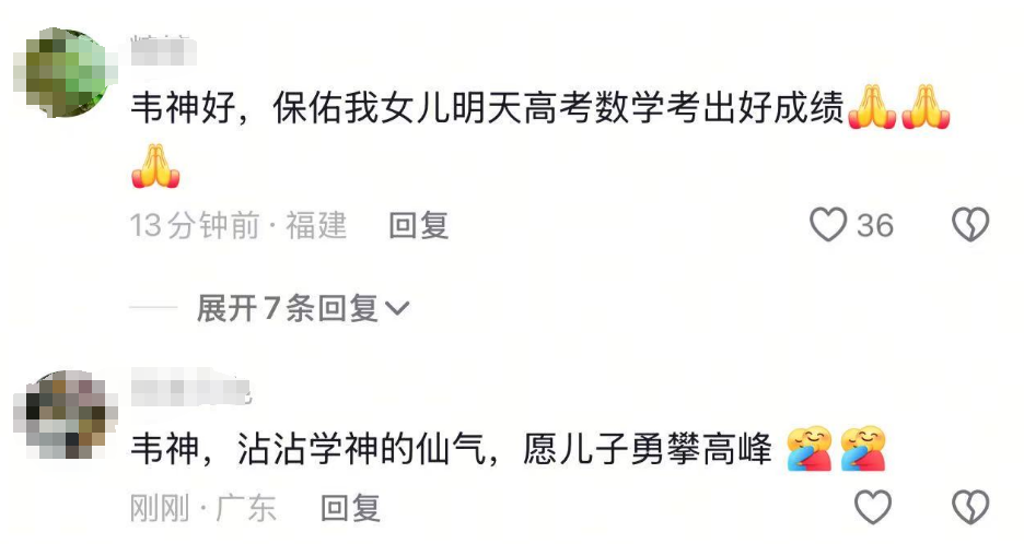 有趣的是,进入高考倒计时,“韦东奕”账号评论区变成了网友的“高考许愿池”,他们纷纷留言,“沾沾学霸喜气”,请教韦东奕如何教孩子学数学。