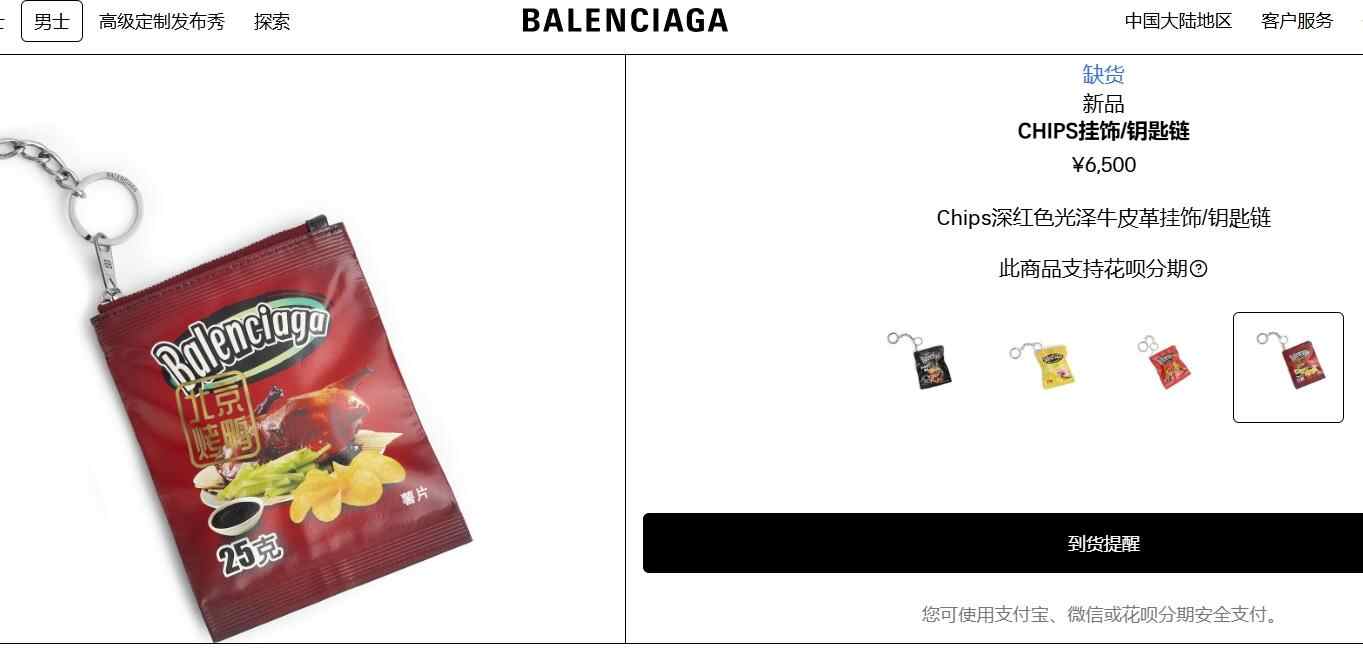 记者在巴黎世家官网搜索发现,该网站并未有该款包饰出售,仅有一款“北京烤鸭”系列Chips挂饰/钥匙链在售,四种颜色,售价6500元,但目前处于缺货状态。