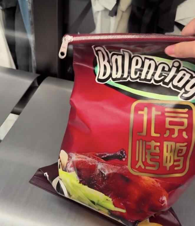 此前,有网友发布的视频显示,该包外形与零食袋相似,呈长方形。包身正面印有一只烤鸭图案,还有“Balenciaga”“北京烤鸭”的字样,背面印有“营养成分”表,封口处有细长条拉链。