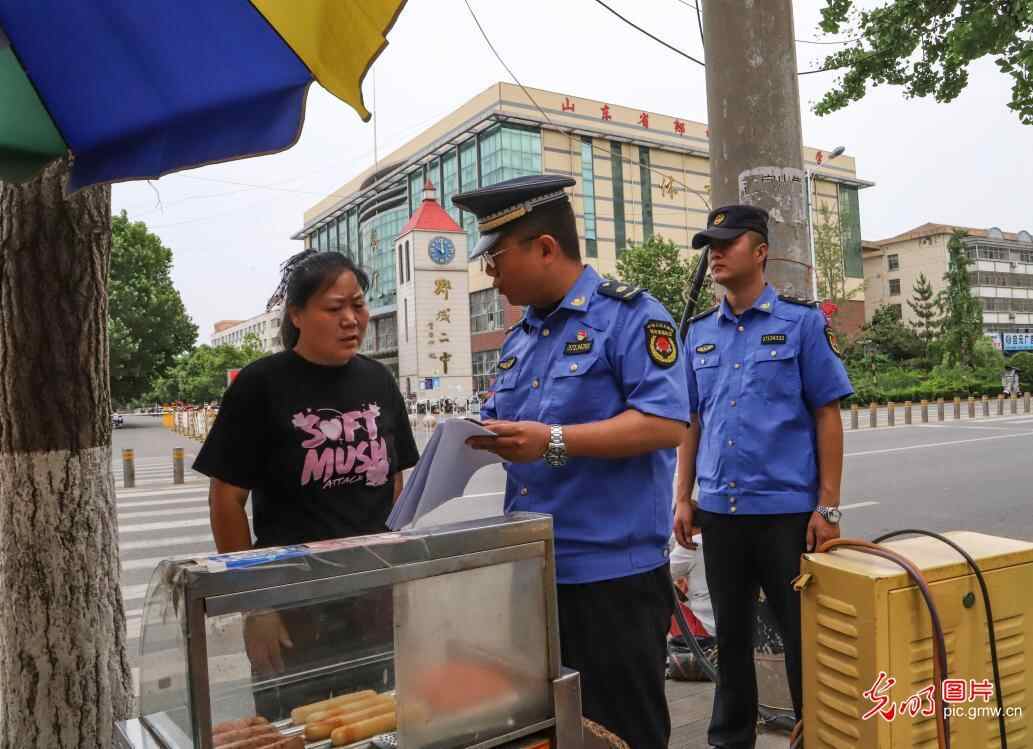 2025年6月3日,山东省临沂市郯城县综合执法人员对高考考点附近的流动商贩进行劝导。