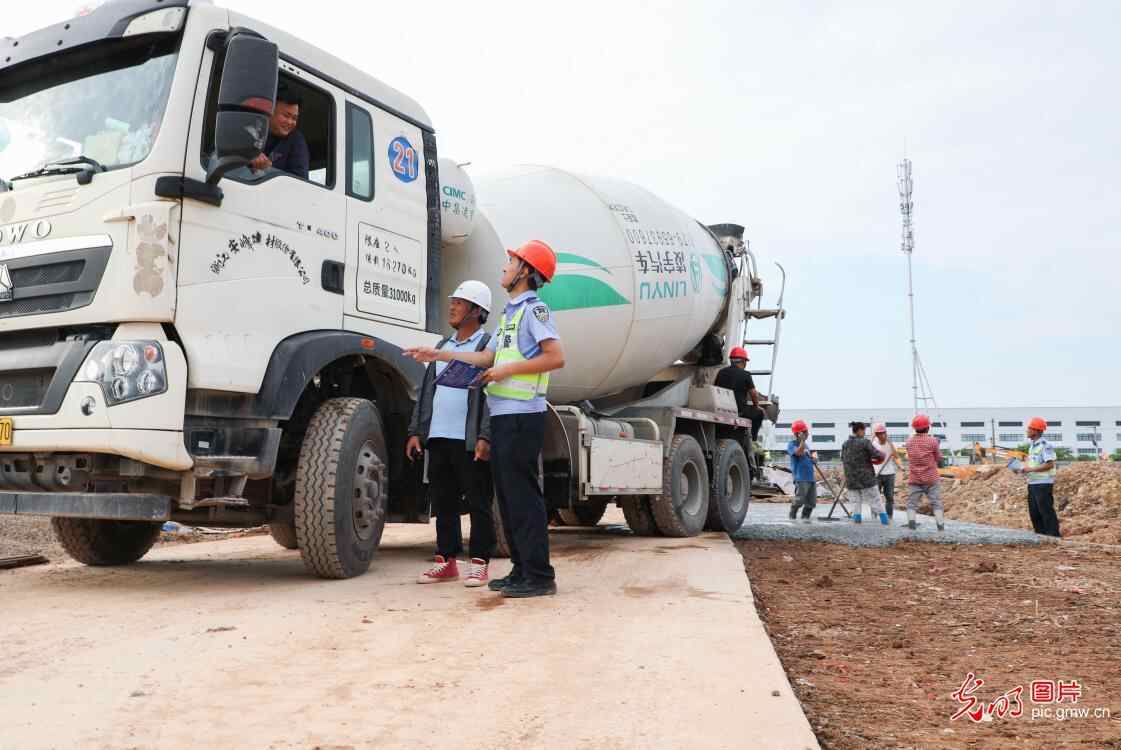 为了给广大考生营造一个良好的备考和考试环境,6月3日,浙江省浦江县公安局交警大队针对建筑工地运输车辆多、噪声污染大等特点,组织民警辅警通过上门排查、现场宣教等方式,面向施工单位负责人、施工作业人员讲解使用切割机、空压机和搅拌机等噪声污染的危害及“静音降噪”对考生的重要性,切实为考生高考期间筑牢“隔音墙”。(杨晓东摄/光明图片)