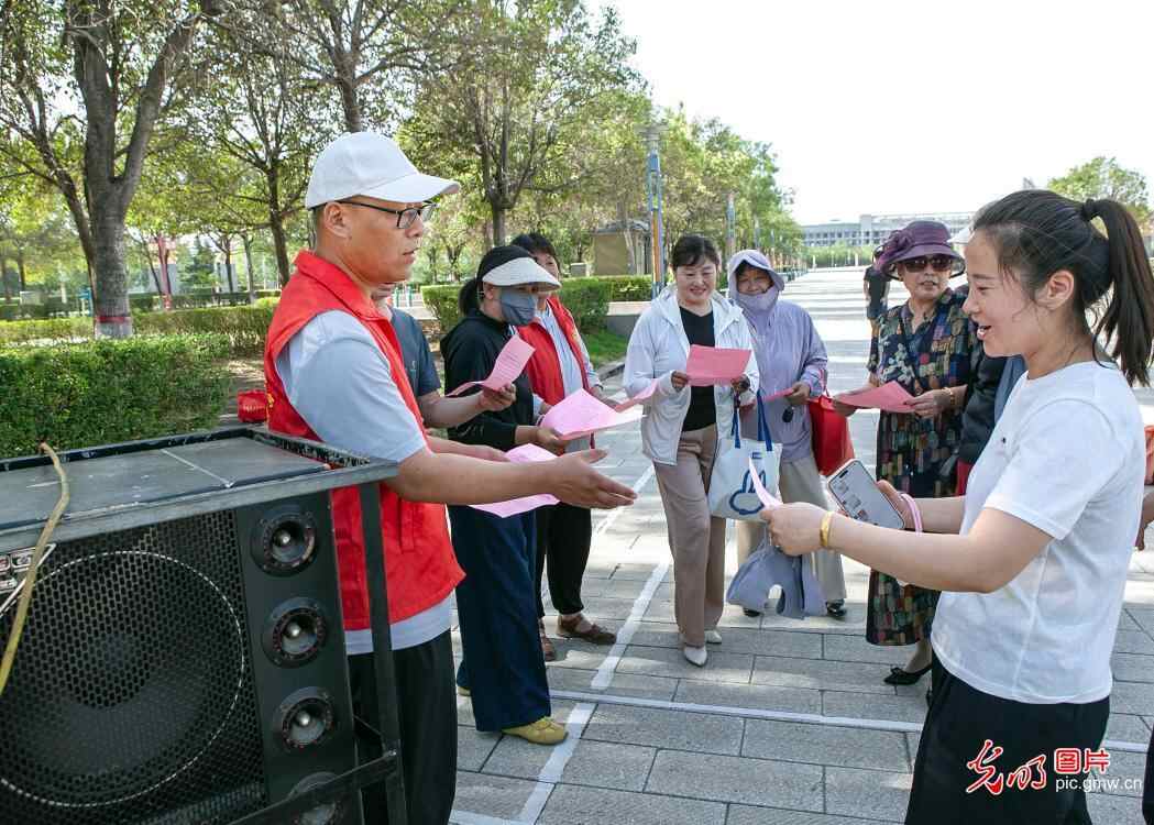 2025年6月4日,在河南省焦作市博爱县人民公园,城管局工作人员向晨练市民发放《高考期间降噪倡议书》。