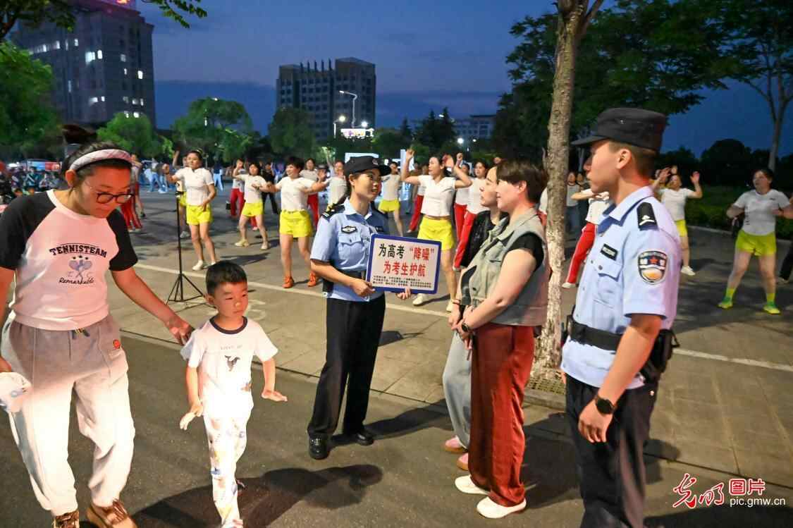 2025年6月3日晚,安徽省马鞍山市和县公安局民警正在向跳广场舞的市民宣传高中考期间“禁噪”规定。