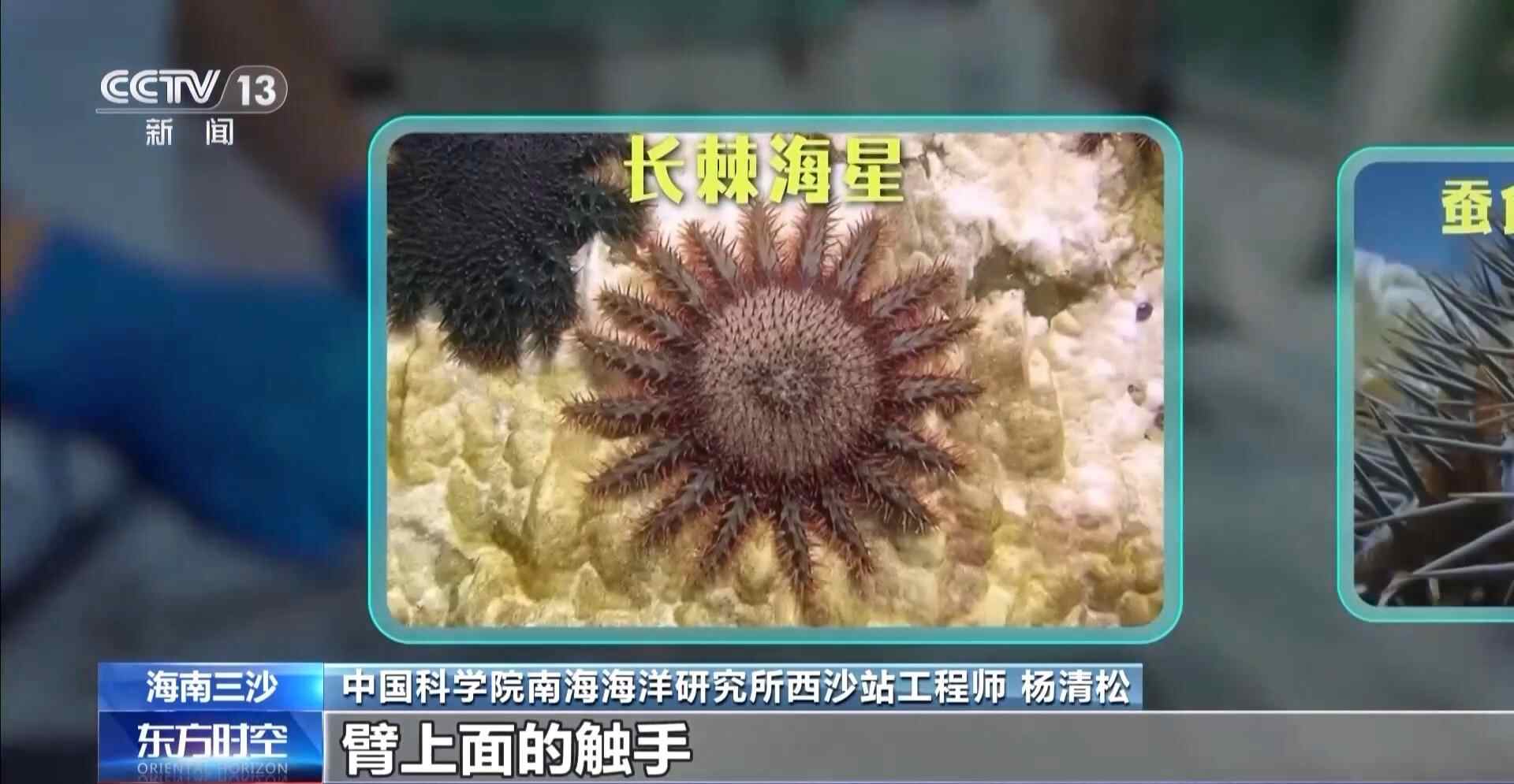 中国科学院南海海洋研究所西沙站工程师 杨清松:这个海星有十几只臂,臂上面的触手,它会伸出来,它把它的胃整个排出来,把珊瑚包裹住,把整个珊瑚的组织给消化掉,只剩骨骼了,这个跟珊瑚白化不一样,吃掉就没办法了。
