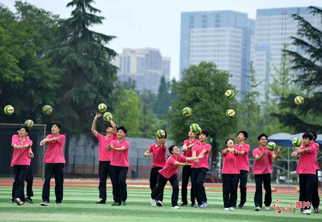 2025年6月3日,四川省成都艺体中学高三学生通过练习排球减压迎高考。