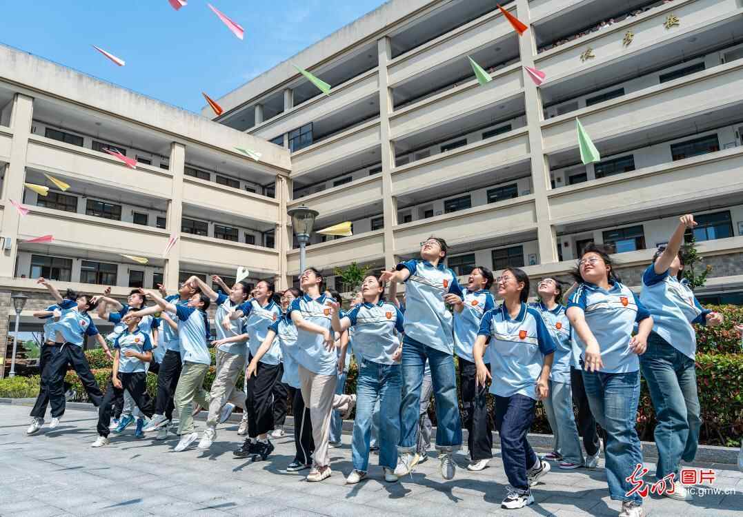 2025年6月4日,江苏省南通市通州区金沙中学的高三学生将装载着自己梦想的纸飞机抛向空中。
