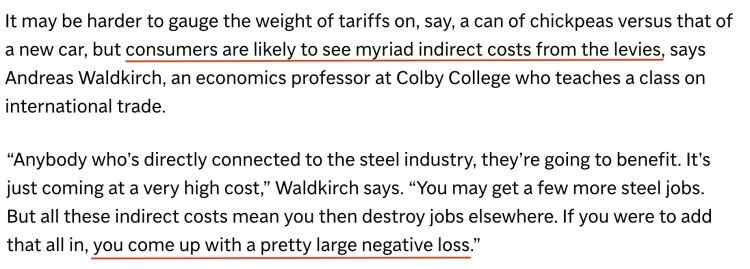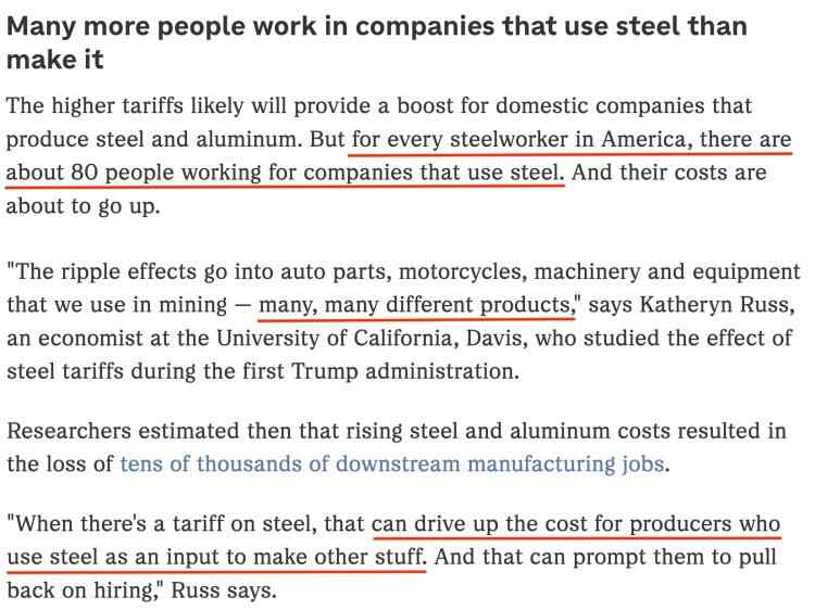 “当对钢铁征收关税时,这可能会推高使用钢铁(材料)制造其他产品的生产商的成本,并可能会促使这些生产商减少招聘。”
