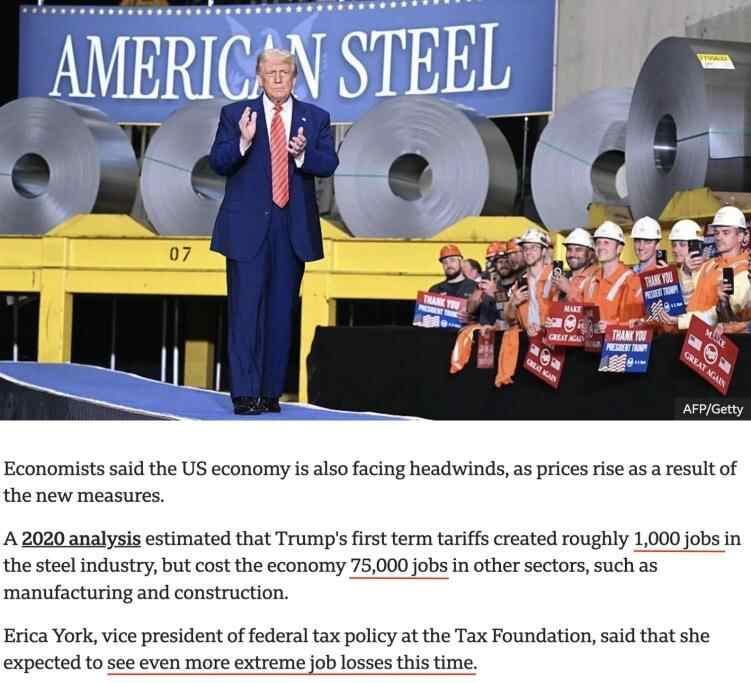 2020年的一项分析估计,特朗普第一任期的关税为美国钢铁行业创造了大约1000个工作岗位,但却让制造业和建筑业等其他更多行业损失了7.5万个工作岗位。