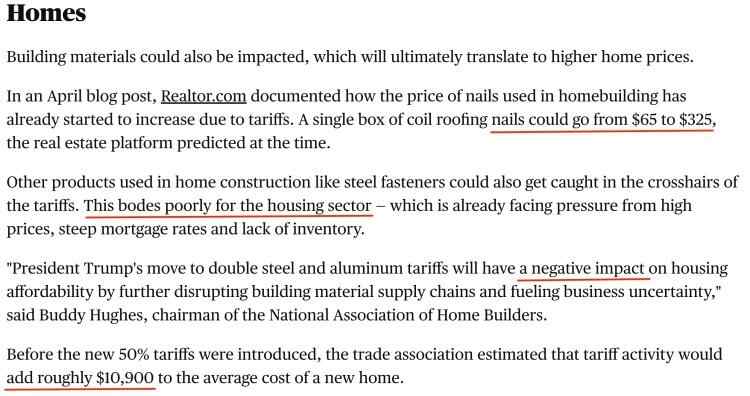 房价可能上涨得更厉害:在50%的新关税出台之前,全美住宅建筑商协会就估计关税将使新房的平均成本增加超过1万美元。而税率翻倍后,仅一盒螺旋状屋顶钉的价格就可能从65美元涨到325美元。
