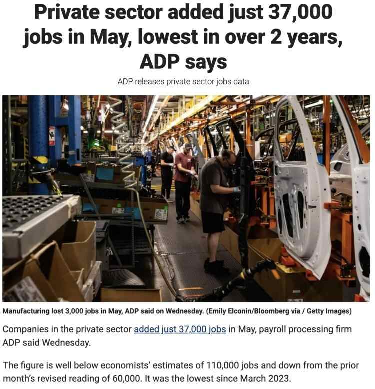还是在4日,美国自动数据处理就业服务公司公布的报告显示,5月美国私营部门仅新增3.7万个就业岗位,较4月的6万个大幅放缓,也远低于市场预测的11.5万,创下2023年初以来的最低水平。