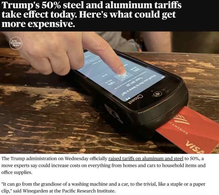 “你怎么可能在买着世界上最昂贵的美国钢材的情况下,与那些能够获得正常市场钢材价格的对手竞争呢?!”——在美国将进口钢铝关税从25%提高至50%的政策4日正式生效后,在美国北卡罗来纳州经营一家钢缆公司的沃尔茨真急了。
