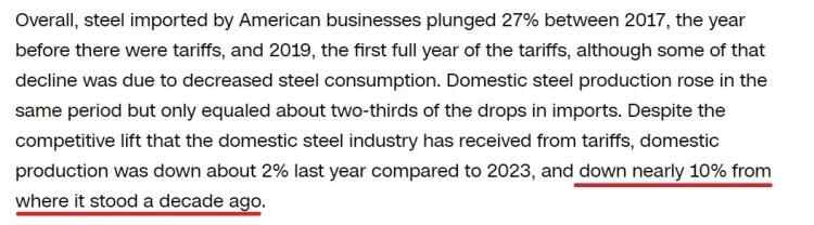 虽然他在第一任期就曾以这个理由对进口钢铁和铝分别加征了25%和10%的关税,但研究显示,这些关税并没有给美国带来产业复兴,去年美国国内钢铁产量较十年前反而减少了近10%,全球竞争力也在下降。