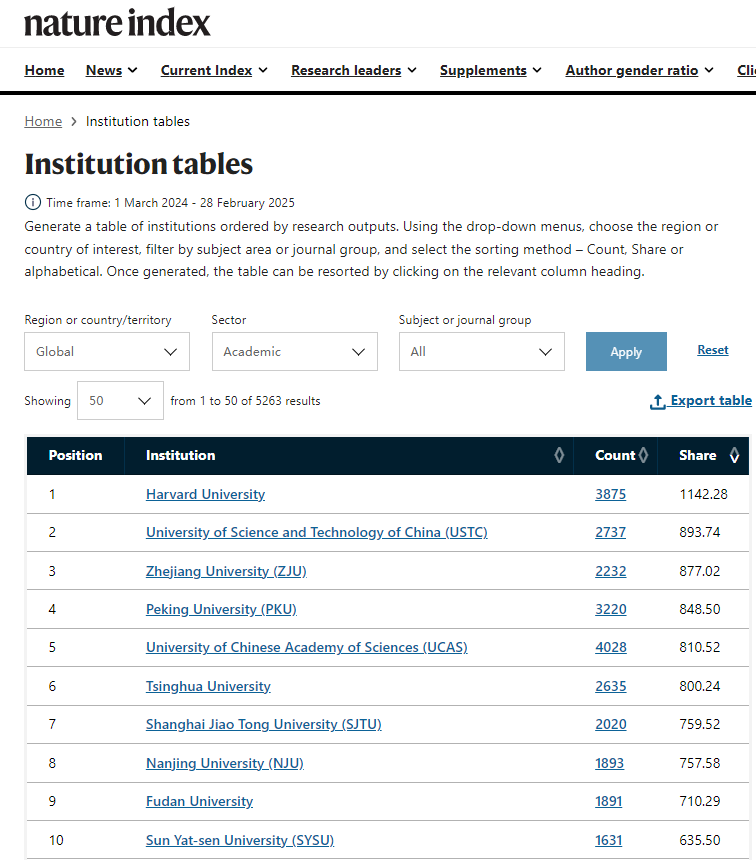 权威学术期刊《自然》杂志编制的自然指数(Nature Index)是衡量高质量科学研究的权威指南。最新排名显示,在自然指数排名前十的学术机构中,有九所是中国大学。