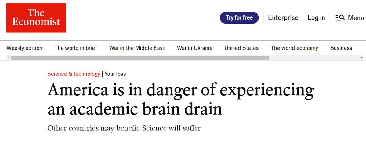 英国《经济学人》文章讨论了特朗普政府政策对美国科学界的影响,特别是在科研经费削减和移民政策收紧的背景下,研究人员流失趋势几乎不可避免。