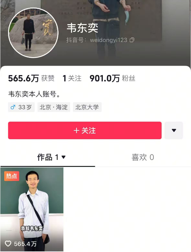 4日晚,北京大学的韦东奕老师开通个人社交平台账号,和网友打招呼,短短4秒的视频吸引粉丝无数。截至6日晚24时46分,韦东奕个人账号粉丝数量突破900万,并且仍在上涨。