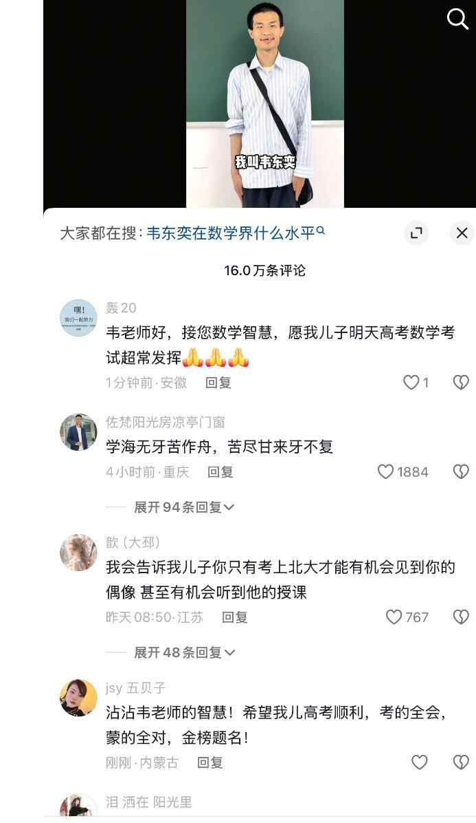 此外,有网友发现在该账号发布的第一条“韦神”和网友们打招呼的视频中,画面显示其部分牙齿掉落,不少网友在评论区留言,希望韦东奕钻研数学的同时,照顾好自己的身体。