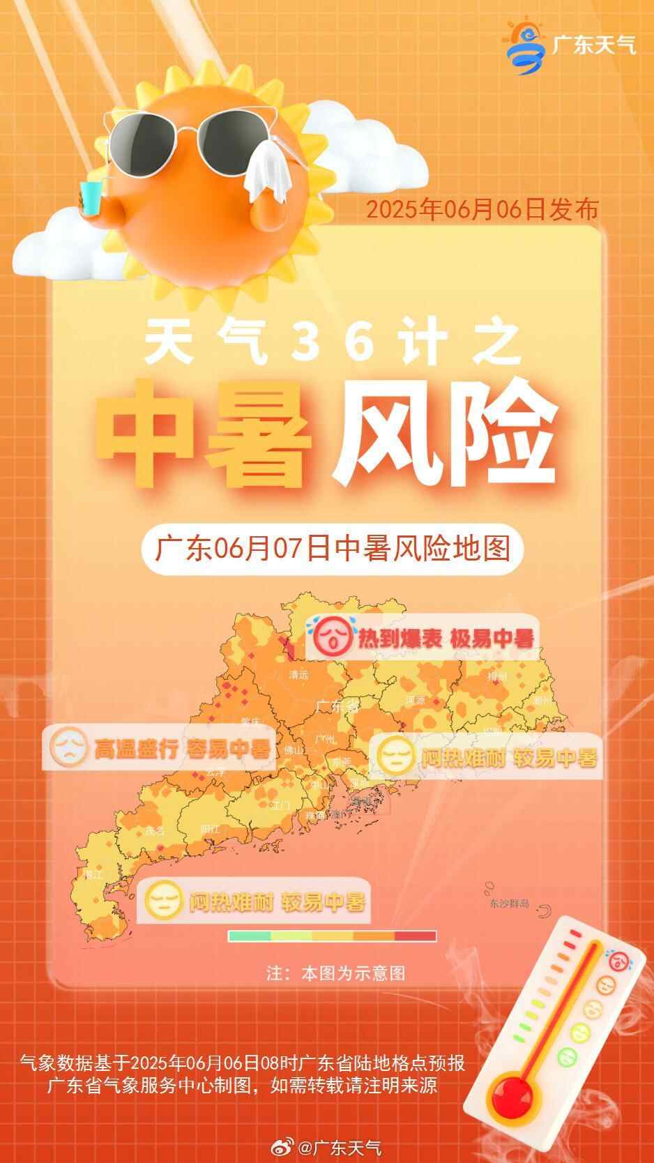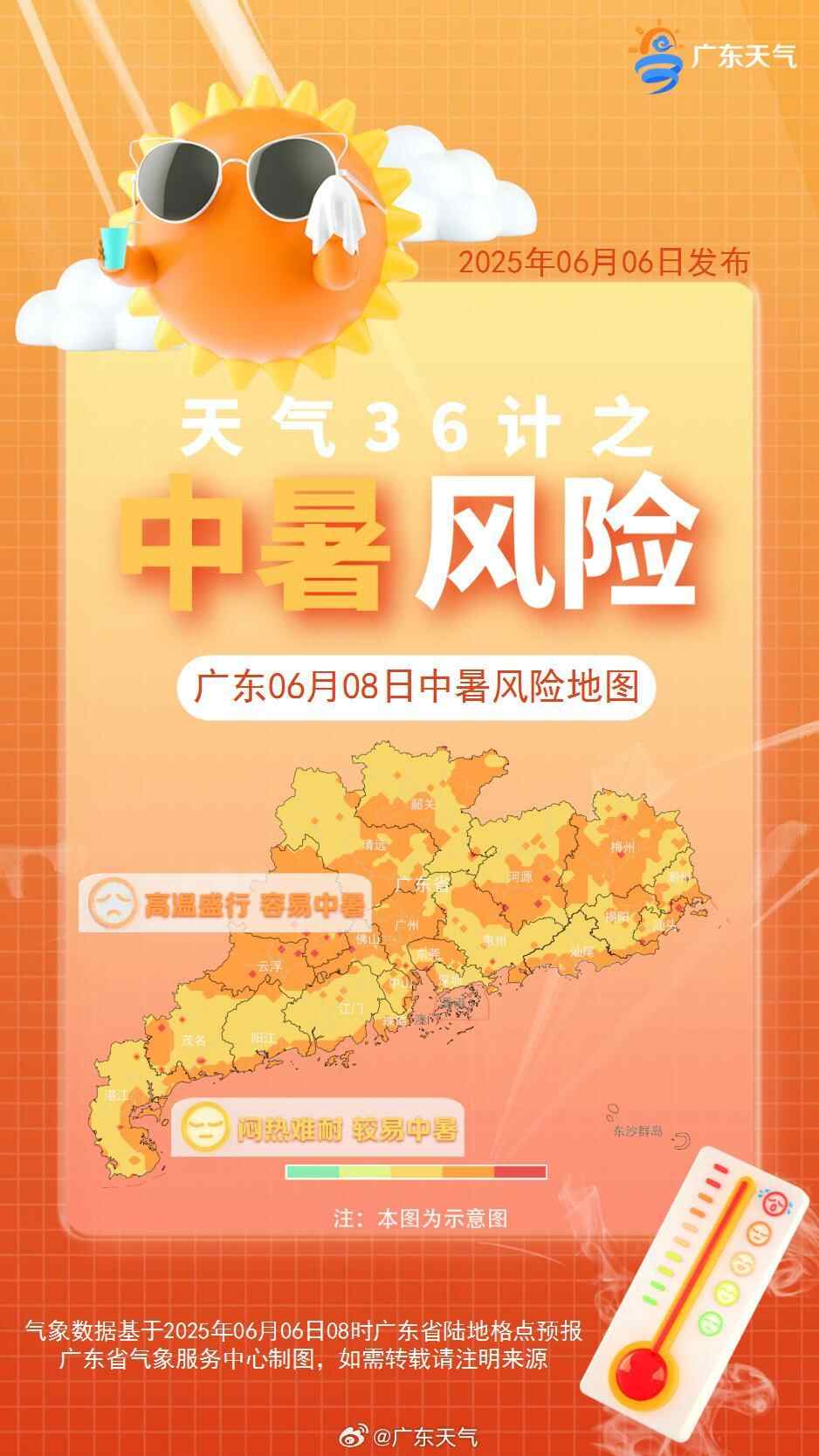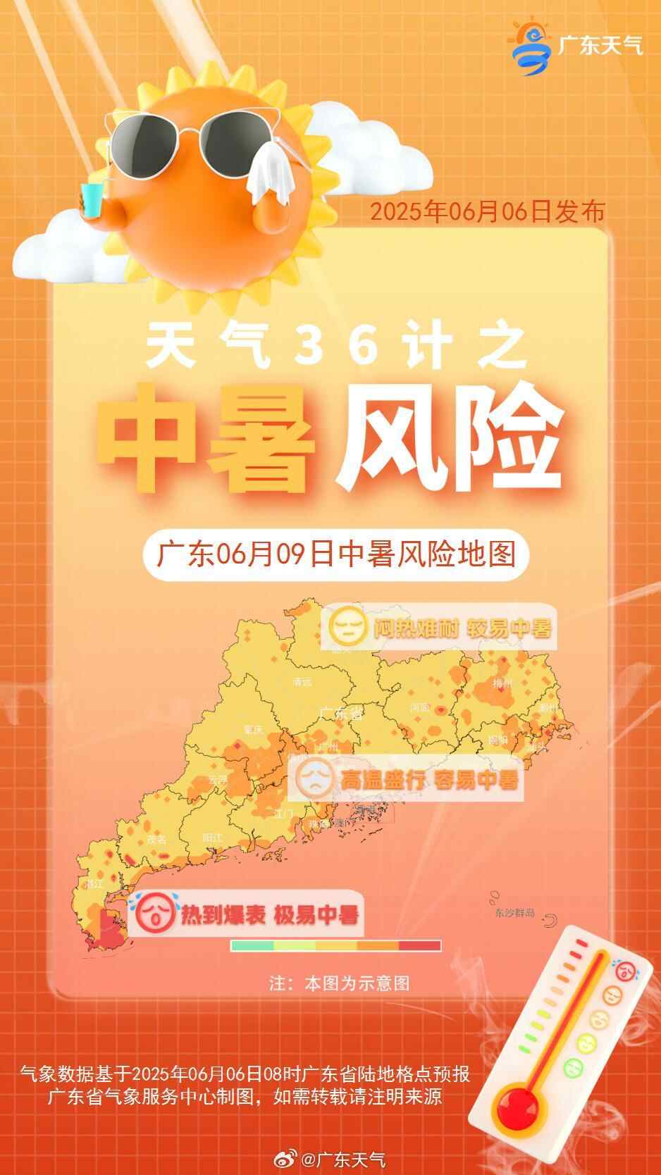 今年高考期间,高温和分散雷雨会陪伴考生一起赴考。下面附上广东省7日-9日中暑风险地图,位于图中橙红色区域的考生和家长们多加留意。