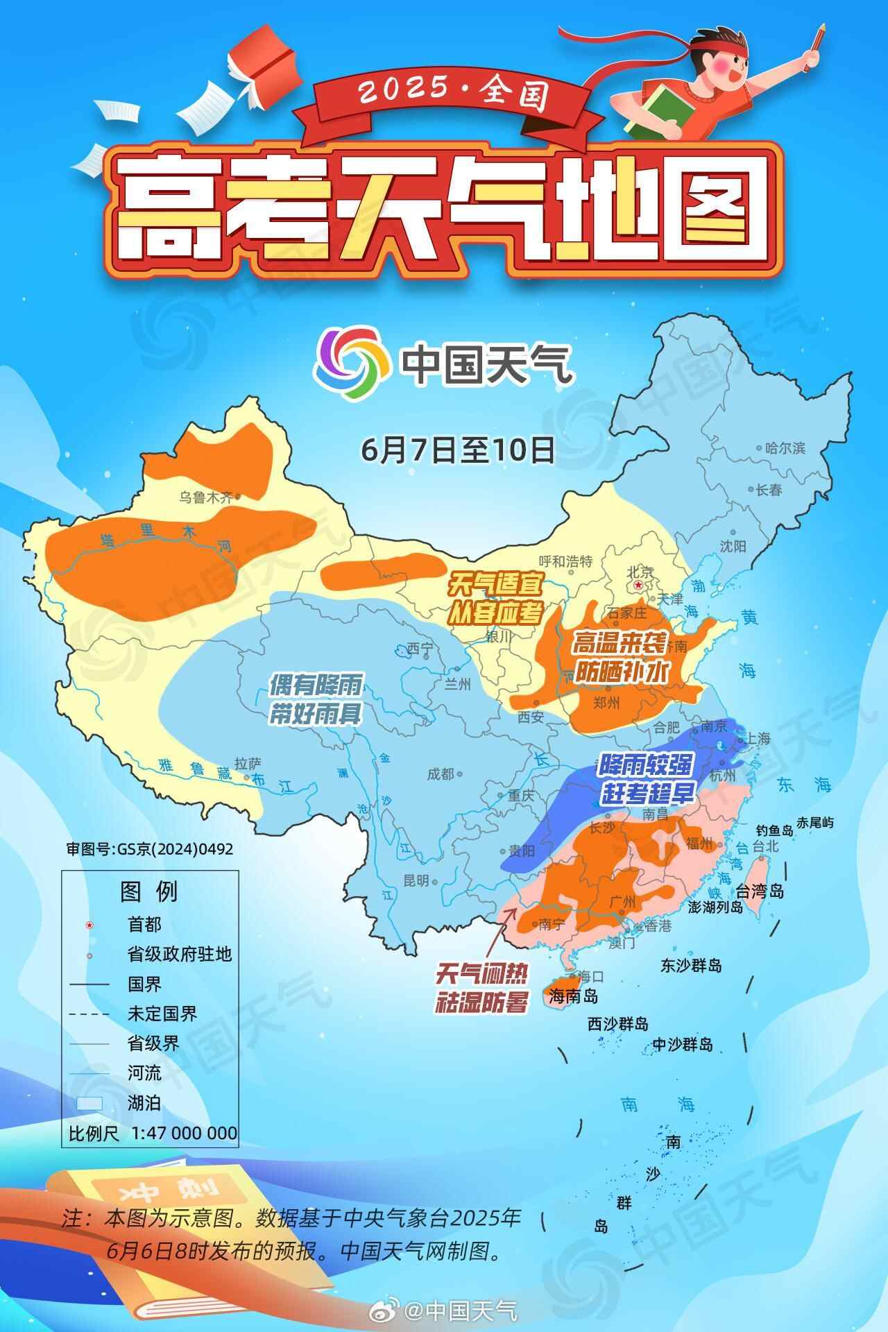 今年高考期间,北京、天津、内蒙古西部、河北北部、山西北部等地天气适宜,有利考生发挥。不过,江淮、江南北部等地雨势较强且伴有强对流,赶考需趁早。同时,华北、黄淮、华南等地高温天气发展,需做好防暑措施,及时补水降温。