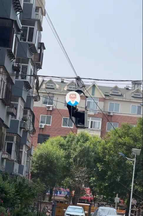 网友拍摄的视频显示,在小区内部,一名老人乘坐的电梯正在上升,运行电梯的线缆一端连接着居民楼,另一端则连接着小区里的路灯杆,随着电梯顶部导轨的移动,电梯也缓慢上升。记者注意到,电梯连接居民楼五楼的一户居民家,而连接路灯杆的线缆一端安装了操作台,上面分布着一些按钮。