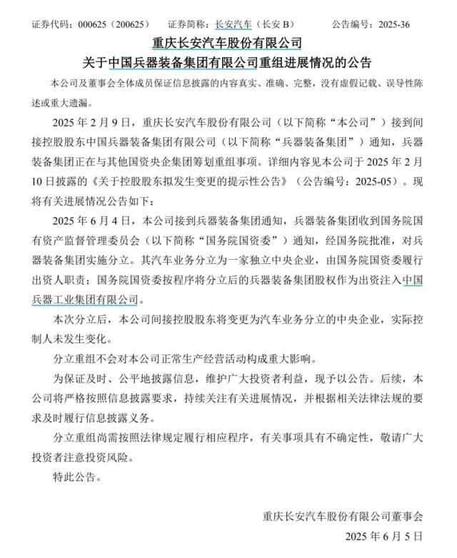 长安汽车6月5日公告称,公司接到兵器装备集团通知,兵器装备集团收到国务院国有资产监督管理委员会通知,经国务院批准,对兵器装备集团实施分立。其汽车业务分立为一家独立中央企业,由国务院国资委履行出资人职责;国务院国资委按程序将分立后的兵器装备集团股权作为出资注入中国兵器工业集团有限公司。本次分立后,公司间接控股股东将变更为汽车业务分立的中央企业,实际控制人未发生变化。分立重组不会对公司正常生产经营活动构成重大影响。