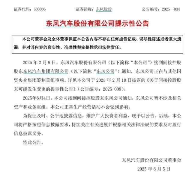 东风股份公告称,本公司接到间接控股股东东风公司通知,东风公司暂不涉及相关资产和业务重组。本公司正常生产经营活动不会受到影响。