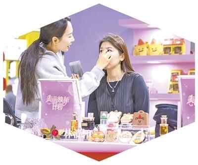 在上海举办的中国美容博览会上,客商亲身体验化妆。施 觉摄(影像中国)