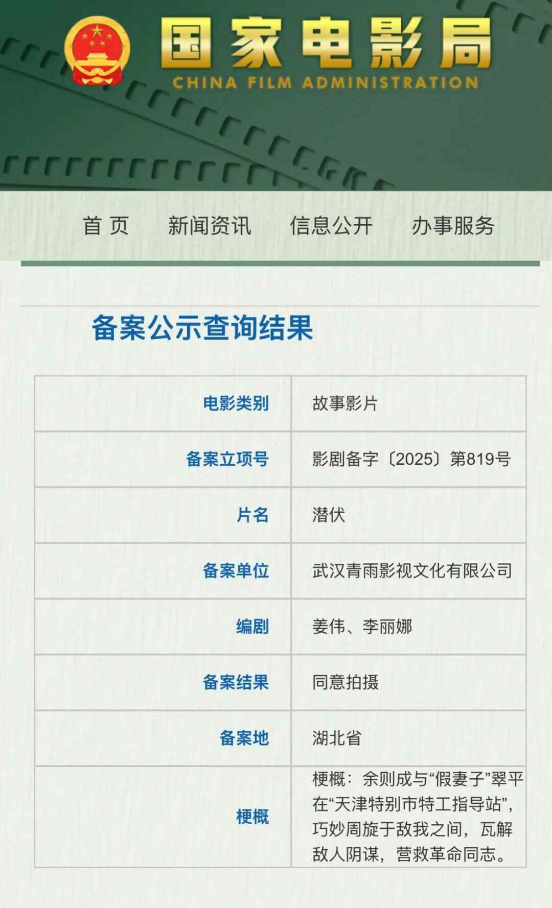 据电影频道融媒体中心,日前,据国家电影局最新备案、立项公示,电影《潜伏》立项,编剧为姜伟、李丽娜。备案单位为武汉青雨影视文化有限公司。