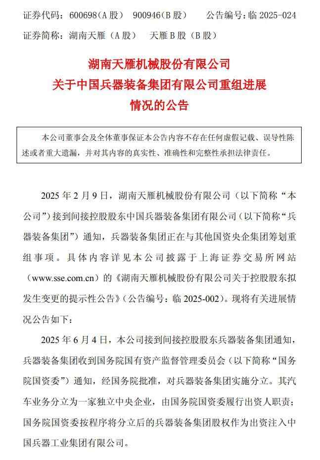 东风股份公告称,2025年2月9日,公司接到间接控股股东东风汽车集团有限公司通知,东风公司正在与其他国资央企集团筹划重组事项。2025年6月4日,公司接到间接控股股东东风公司通知,东风公司暂不涉及相关资产和业务重组。本公司正常生产经营活动不会受到影响。