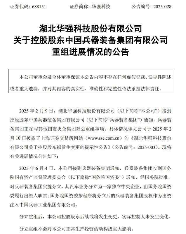 此外,东安动力(600178)、长城军工(601606)、湖南天雁(600698)、华强科技(688151)等5日也发布了类似公告。