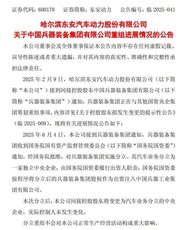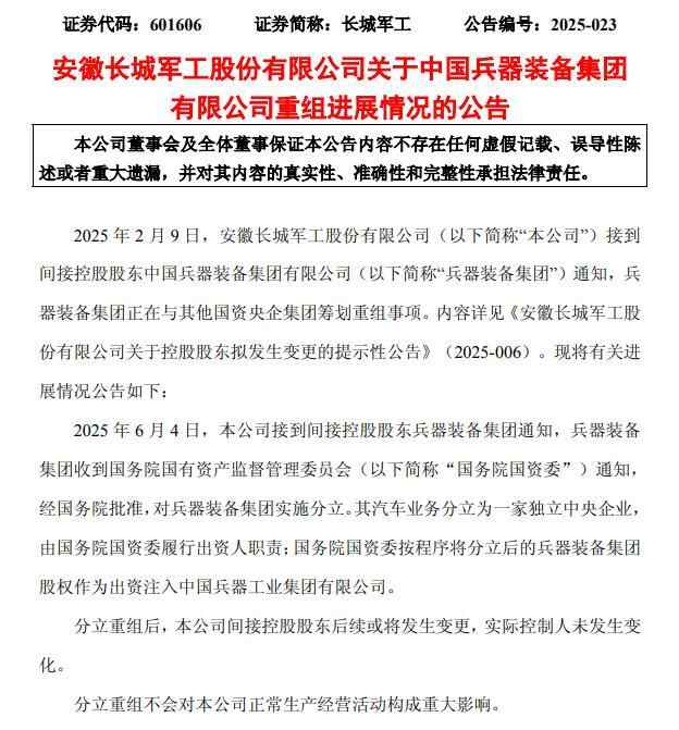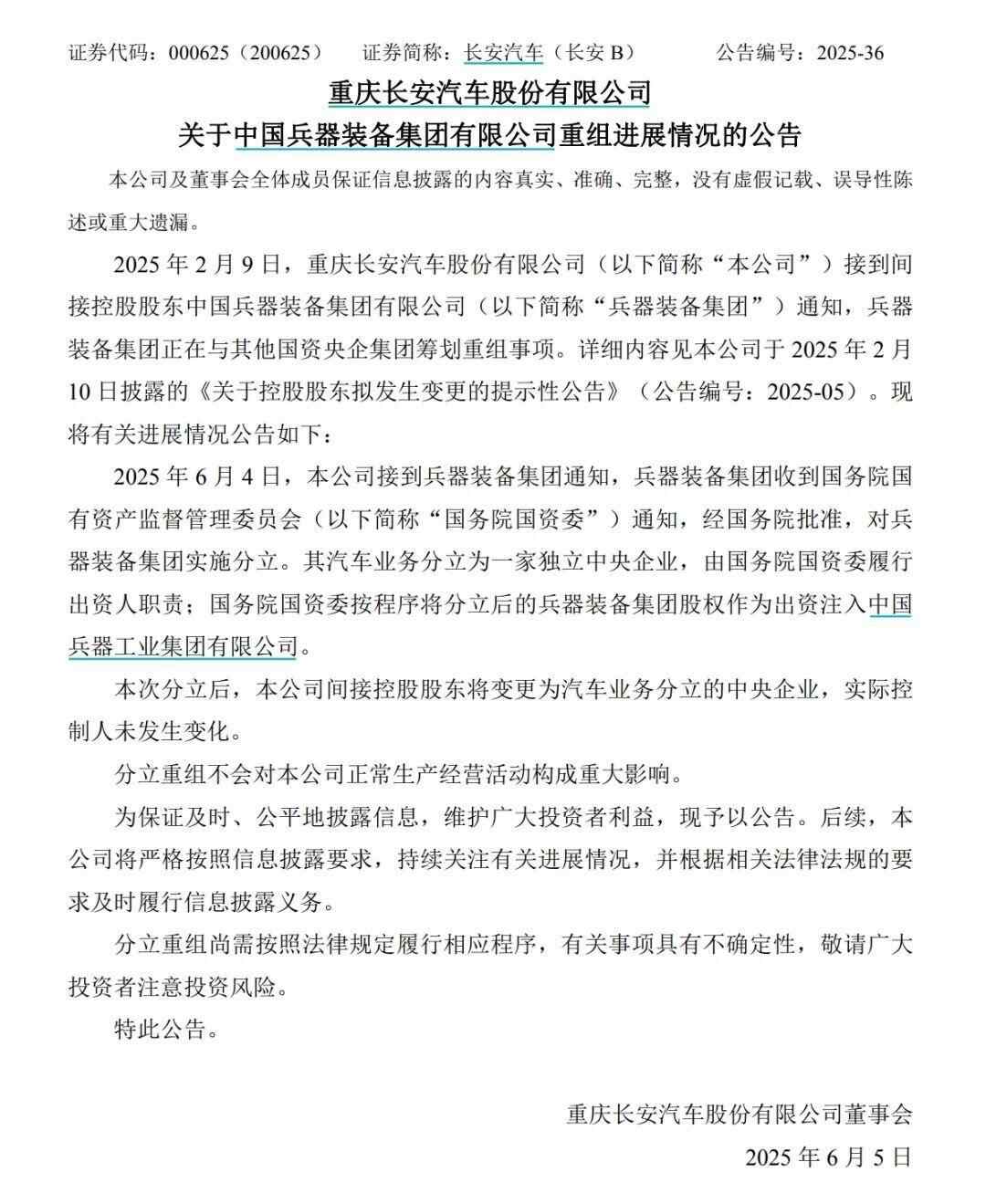 长安汽车公告称,公司接到兵器装备集团通知,兵器装备集团收到国务院国有资产监督管理委员会通知,经国务院批准,对兵器装备集团实施分立。其汽车业务分立为一家独立中央企业,由国务院国资委履行出资人职责;国务院国资委按程序将分立后的兵器装备集团股权作为出资注入中国兵器工业集团有限公司。本次分立后,公司间接控股股东将变更为汽车业务分立的中央企业,实际控制人未发生变化。分立重组不会对公司正常生产经营活动构成重大影响。