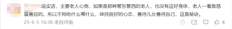 还有网友表示,老人心宽,不管闲事不操心,心态良好才是长寿秘诀。