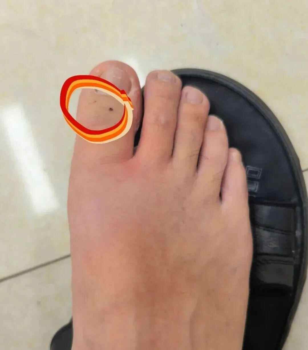 在黄先生提供的图片上记者看到,他躺在病床上,右脚上缠着纱布。还有照片显示,右脚大拇指上有两个明显的小眼。