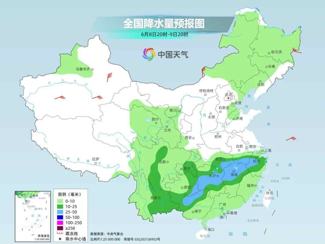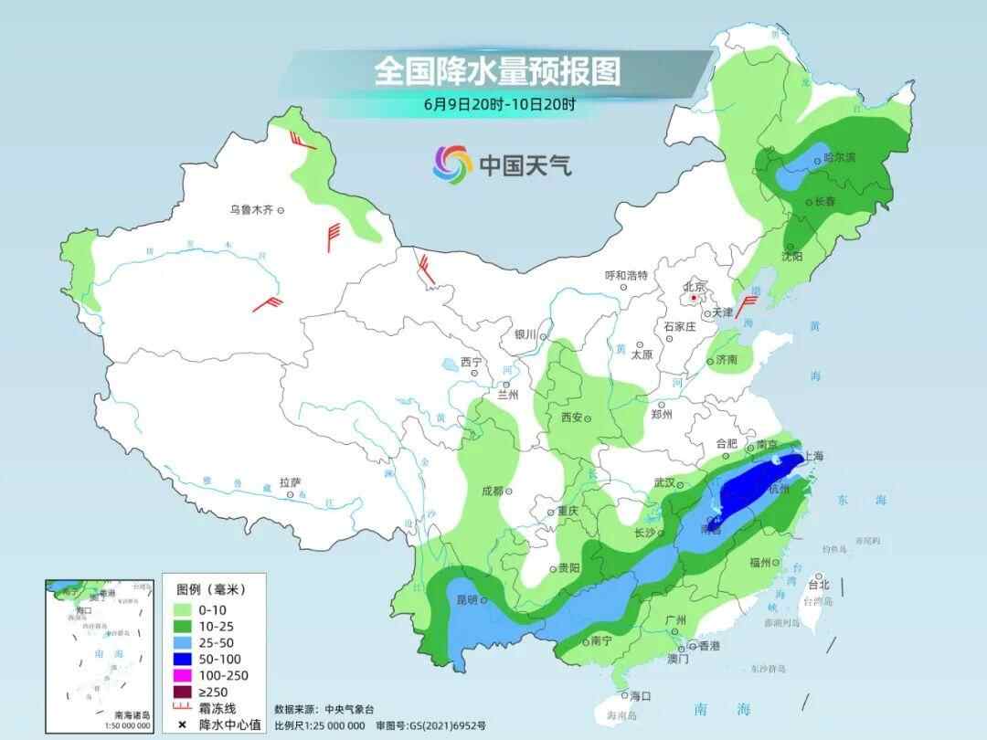 9日至10日,雨带大致呈现东北-西南走向,其中,10日安徽南部、江苏南部、上海、浙江北部、江西北部等地有大到暴雨。