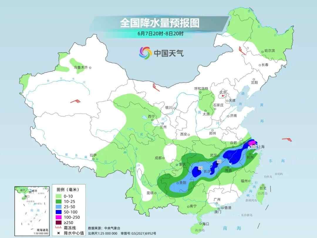 7日夜间至8日,湖南西部和东北部、湖北东南部、安徽中南部、江西北部、江苏南部、上海等地部分地区有暴雨或大暴雨。