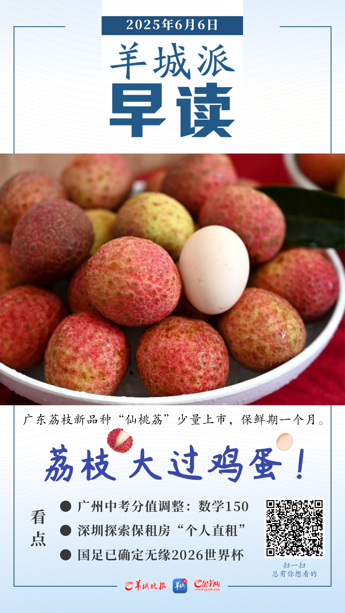 ◆谁在广州塔高调表白!66给“荔”节亮灯。详情-->比鸡蛋还大的荔枝!广东荔枝新品种“仙桃荔”甜爆上新,保鲜期一个月。详情-->粤港澳大湾区今年首开高铁“荔枝专列”。详情-->《长安的荔枝》7日开播,东莞荔枝同期上市中。详情-->