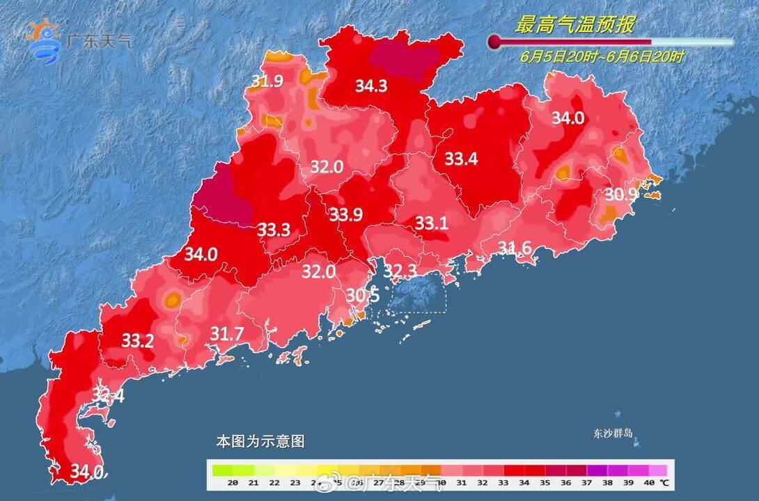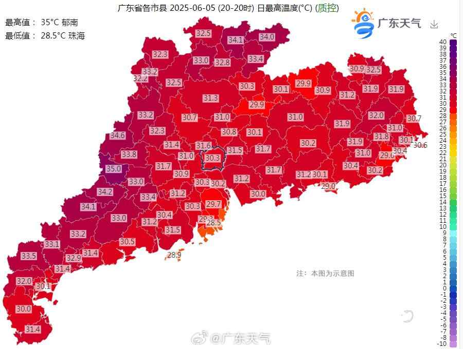 广东方面,高考期间分散雷雨和高温天气并存。5日广东最高温度图显示,郁南35℃拿下全省第一名,最低的珠海也有28.5℃,全省大部最高气温集体跨过30℃。