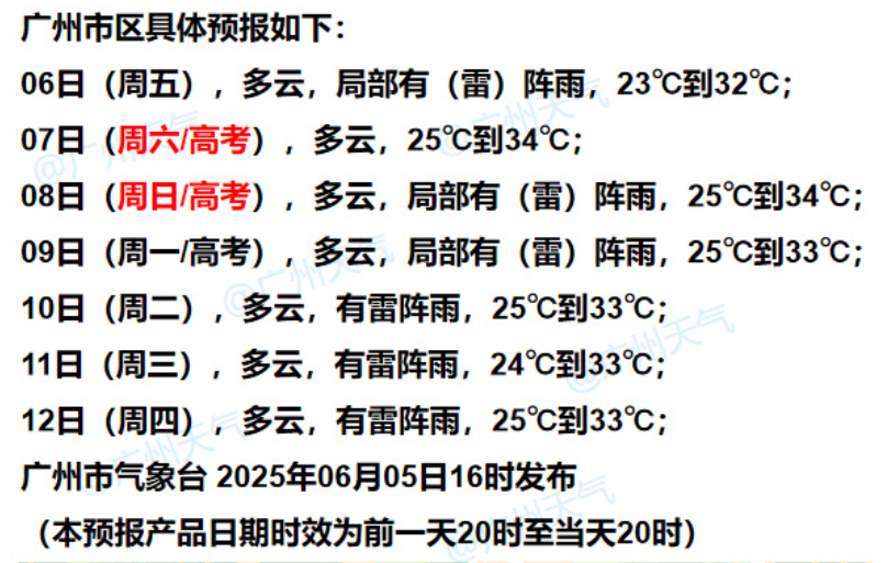 @广东天气预计,高考期间(7-9日),广东多云天气为主,有分散(雷)阵雨,局部雨势大,中北部市县有35℃~37℃的高温天气。