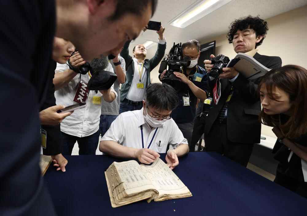 5月14日,在日本东京,工作人员在日本国立公文书馆翻阅侵华日军细菌战部队“登字1644部队”留守名簿,寻找写有竹上胜利父亲宫下利市的文字记录。新华社记者贾浩成摄