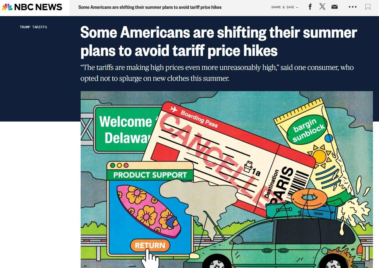 对于美国普通消费者而言,关税也让他们今年的夏天和往年有所不同。美国全国广播公司网站近日的一篇文章说,美国政府的关税政策,让美国消费者对自身成本的担忧持续加剧,他们不得不减少休闲活动和购物狂欢。