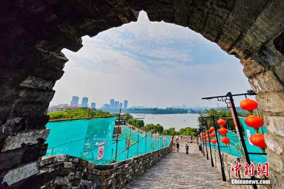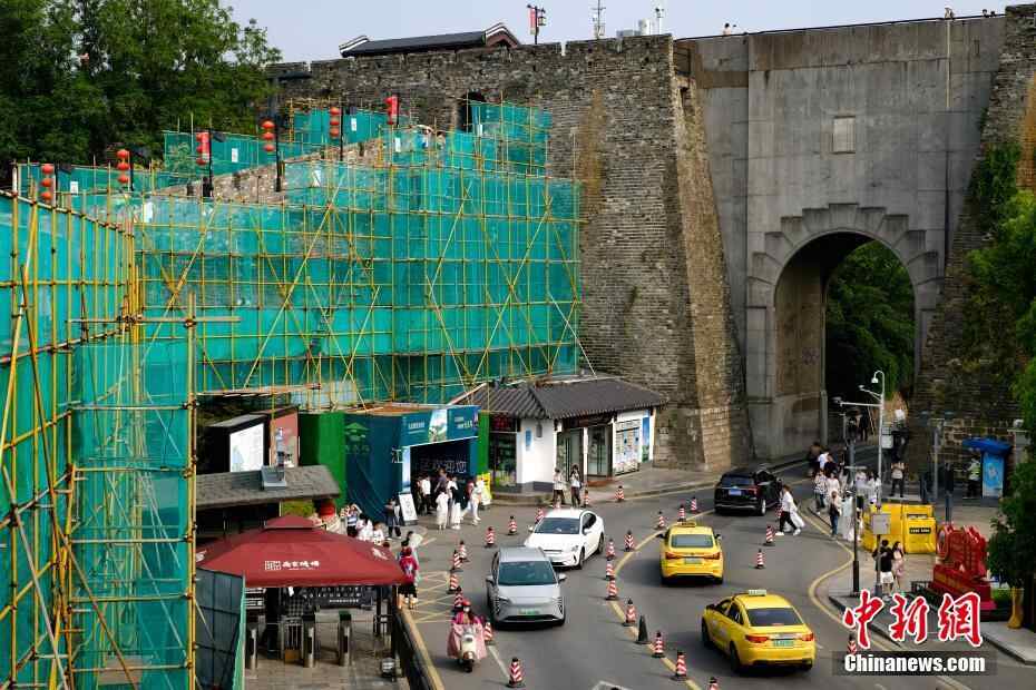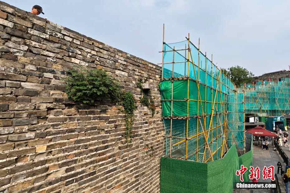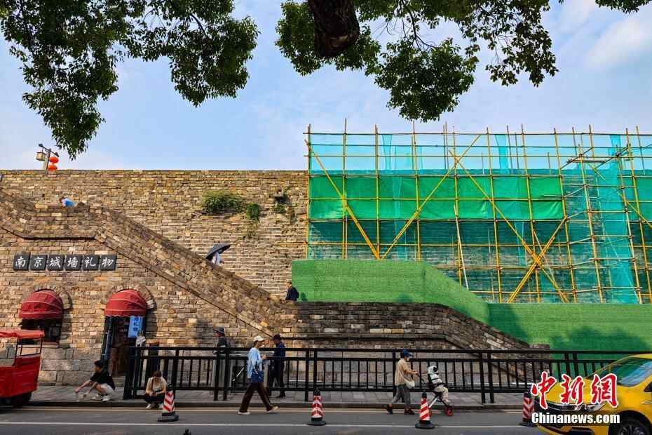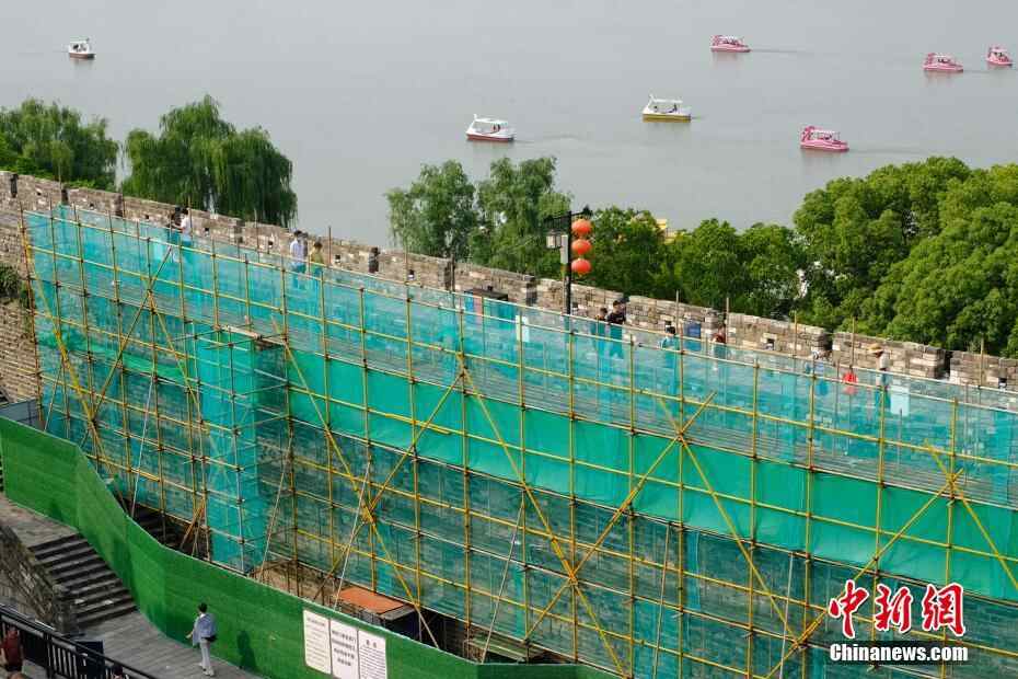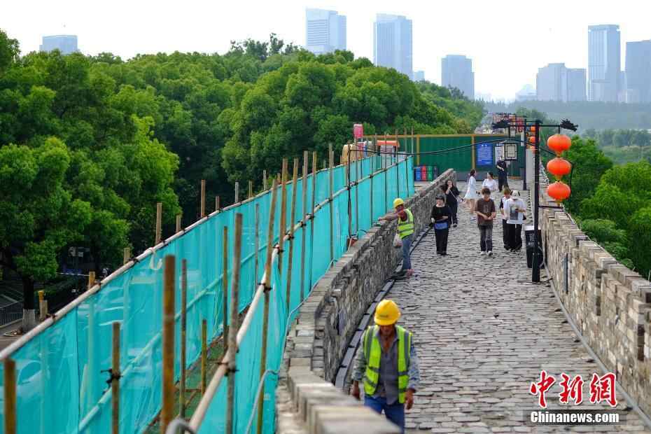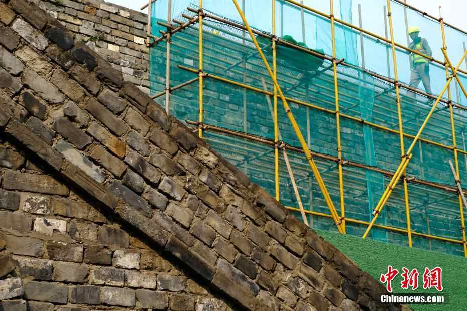 6月3日,江苏南京,明城墙解放门段围挡施工。近日,该段明城墙保护修缮工程展开,施工人员对墙体进行清理并加固,确保城墙整体“健康”。