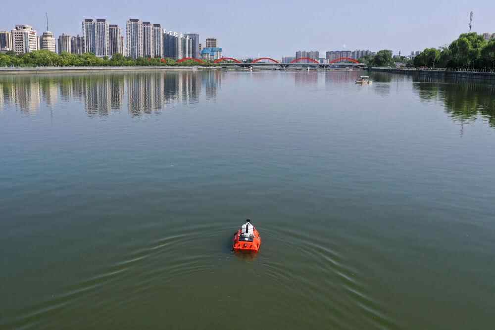 无人船在汾河太原段作业(2024年8月6日摄),它能实时掌握汾河水质状况及水质变化规律,为流域生态环境治理提供技术支撑。新华社记者杨晨光 摄