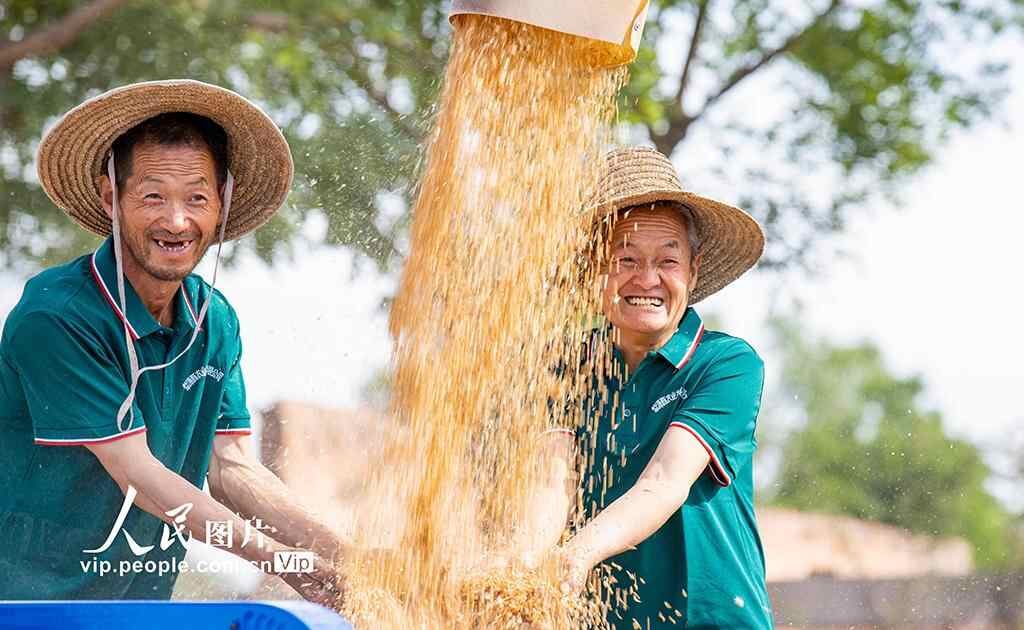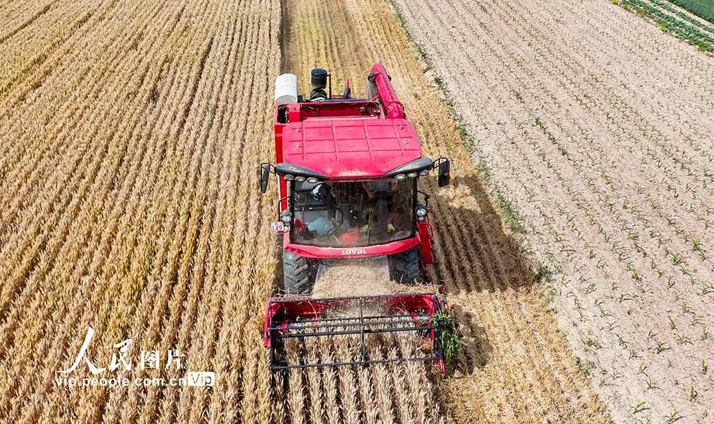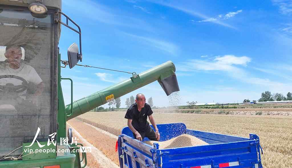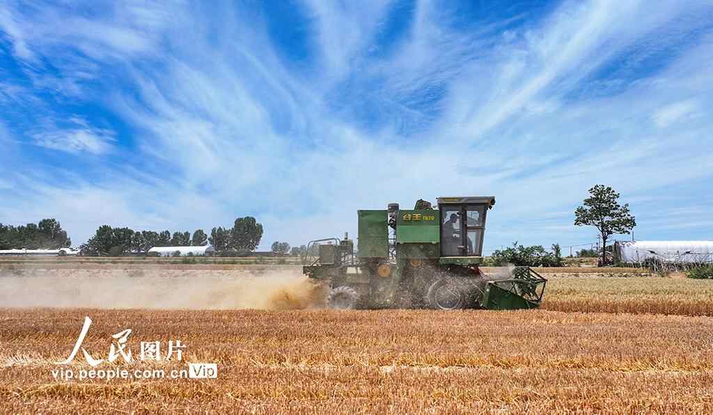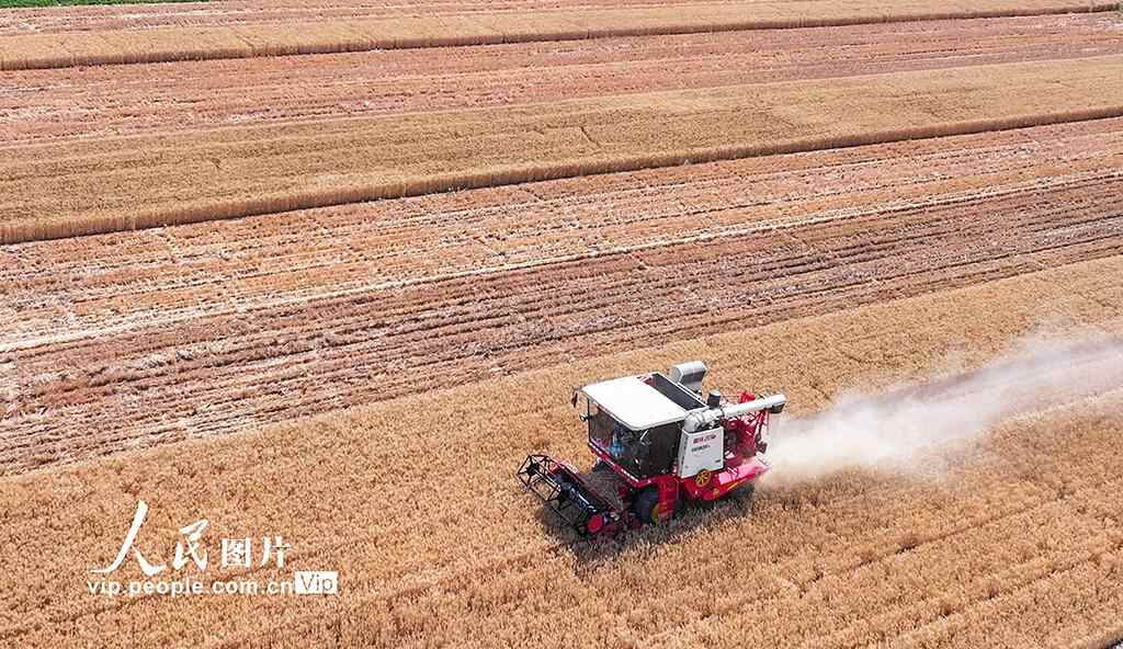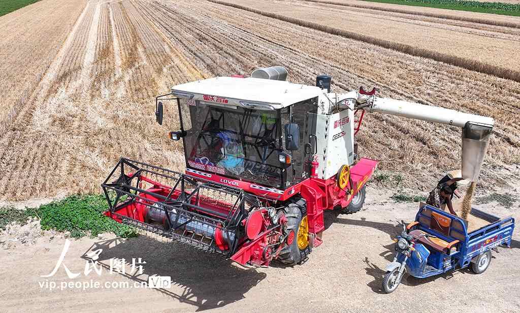2025年6月3日,山西省运城市夏县瑶峰镇、胡张乡、尉郭乡,一辆辆收割机驰骋在田间为农民抢收小麦。姚中吉摄(人民图片网)