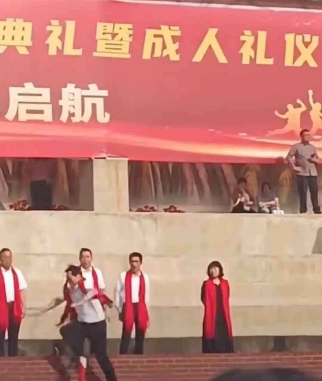 网上多条视频显示,6月3日,在一场名为“青春绽放,梦想启航”2025届高三毕业典礼暨成人礼的活动上,10多个人依次排开站在主席台上,女主持人正在致欢迎辞,有一人突然摇晃着身体从队列里走出,往主席台前面走,然后掉落。