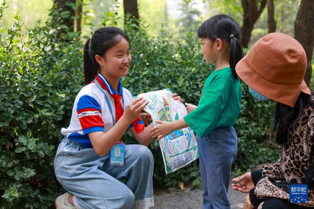 6月3日,山东省枣庄市薛城区双语实验小学在薛城区城市森林公园开展“手绘环保袋 传递绿色梦”主题活动。这是学生给路人赠送手绘环保袋。