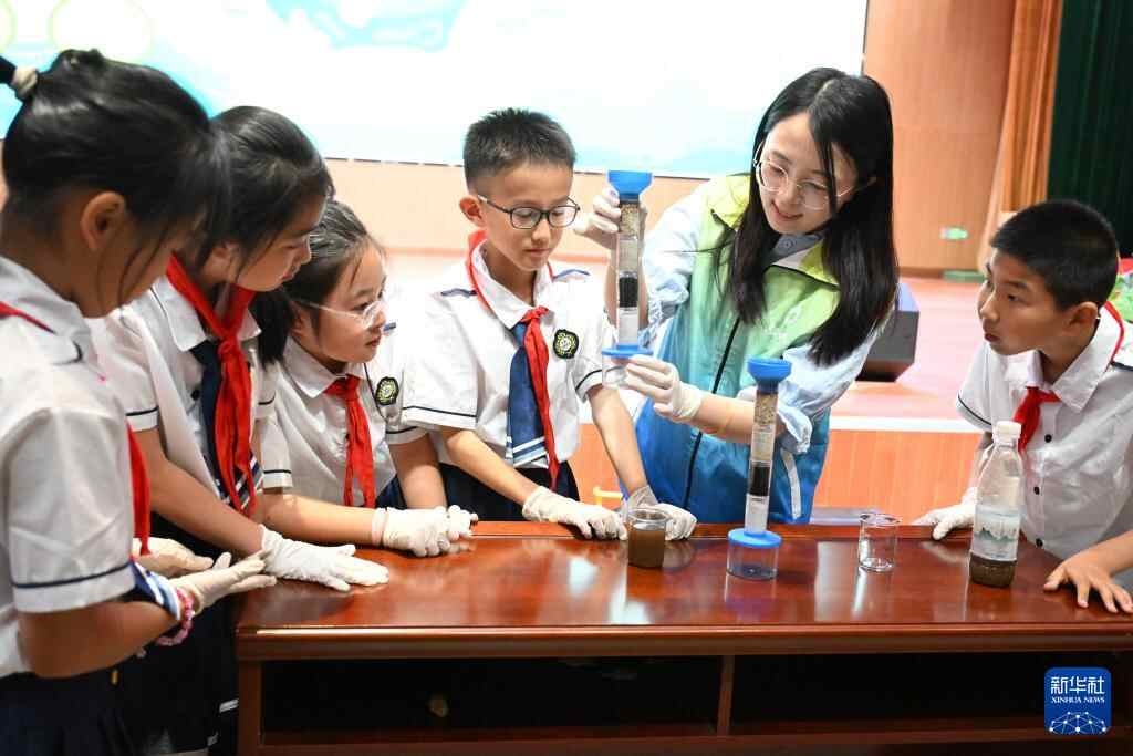 6月3日,在山东省青岛市即墨区德馨小学东部分校,水务公司志愿者带领学生们开展净水实验,分享净水知识。