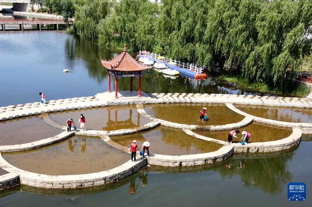 6月3日,环保志愿者在山东省平邑县郑城镇四合村河坝上捡拾垃圾(无人机照片)。
