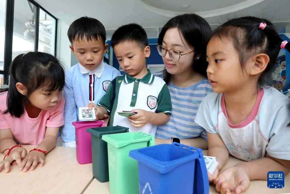 6月3日,在江苏省苏州市姑苏区平润实验幼儿园开展的“保护环境 从我做起”活动中,小朋友在模拟垃圾分类投放。