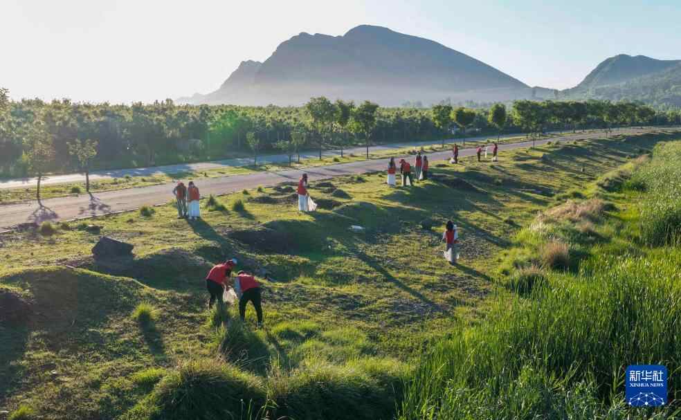 6月4日,河北省遵化市堡子店镇志愿者在捡拾河道岸边的垃圾杂物(无人机照片)。